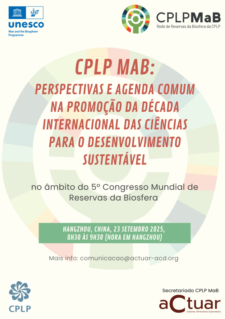 – September 23: parallel session organized by CPLP MaB, between 8:30 a.m. and 9:30 a.m. (local time in Hangzhou, China), entitled “Perspectives and Common Agenda in Promoting the International Decade of Science for Sustainable Development”. It is expected to be a moment of sharing and discussion among participants from Portuguese-speaking countries, with online participation possible through this link.